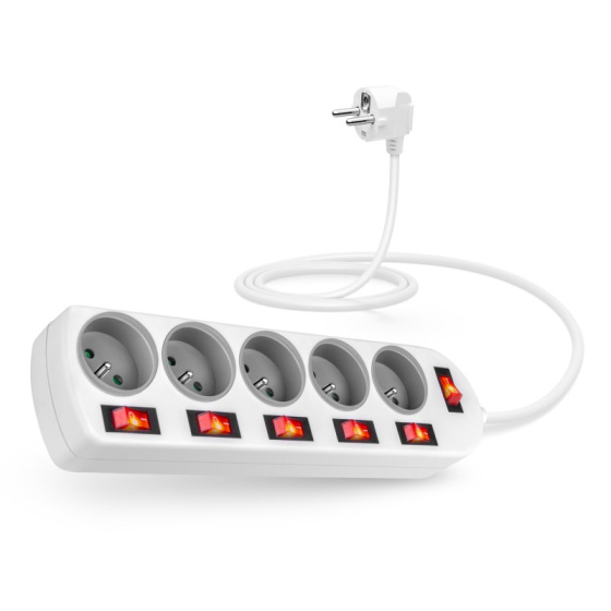 Prodlužovací káblový prívod na 230 V je vybavený hlavným sieťovým vypínačom, ktorý pri vypnutí úplne odpojí od prívodu elektrickej energie všetky zapojené spotrebiče naraz. Prodlužovací kábel tiež disponuje vypínačmi pre každú zásuvku zvlášť, sami si zvolíte, ktoré zásuvky budú kedy zapnuté alebo vypnuté bez potreby odpojenia pripojovacieho kábla od elektrospotrebiča. Extra výbavou je detská ochrana všetkých zásuviek – zásuvky sú prístupné iba v prípade zasunutia oboch vidlíc naraz, teda nie je možné zasunúť jednotlivé, napríklad skrutkovač alebo pletacia ihlica. Vďaka pootočeniu zásuviek o 45° je možné používať aj objemnejšie napájacie adaptéry alebo uhlové koncovky.