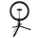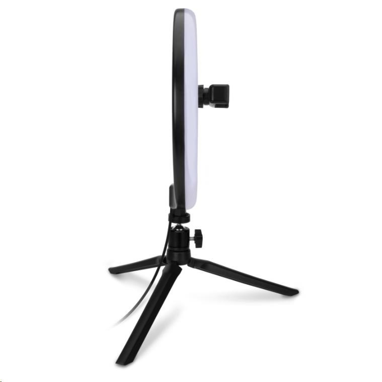 Kruhové selfie LED svetlo "Selfie10Ring" s flexibilným držiakom na mobilný telefón a statívom s guľovou hlavou pre domáce aj profesionálne použitie umožňuje nastaviť farebnú teplotu svetla na 3 rôzne úrovne (3000/4500/6500 K). Súčasťou výbavy je diaľkové ovládanie na kábli.