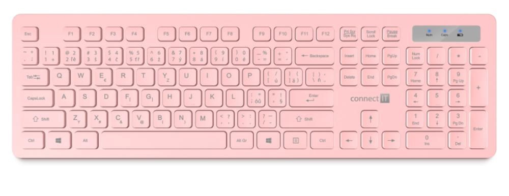Bezdrátová klávesnice a optická myš v elegantním růžovém designu, určena pro domácí i profesionální použití v kancelářích a firmách.