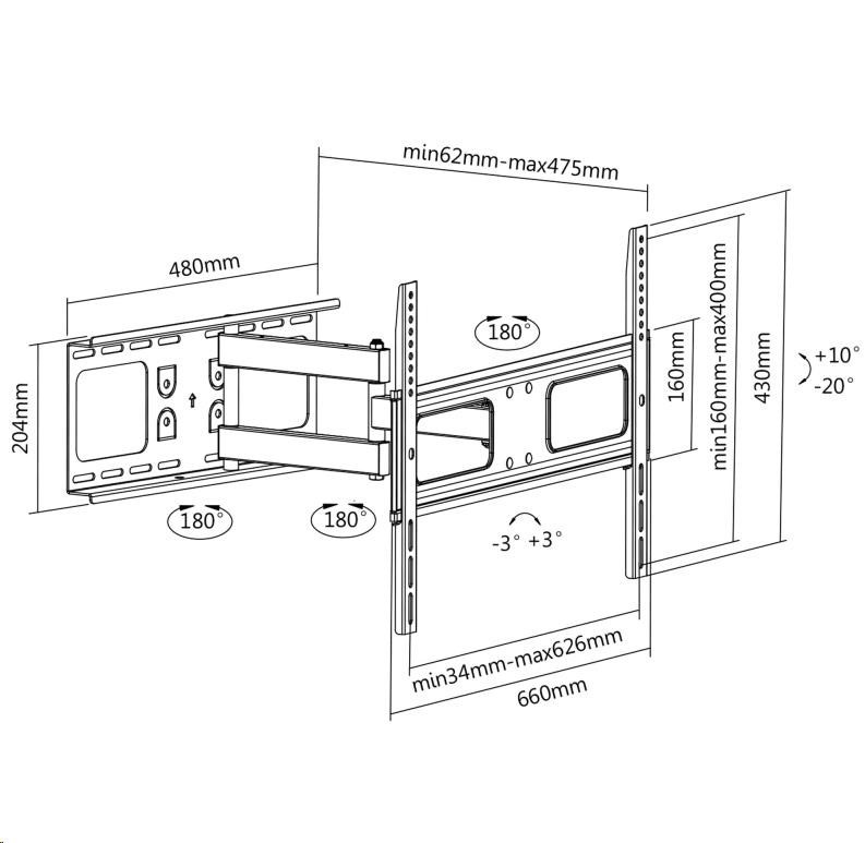 • Rozmery držiaka (š x v x h): 660 x 430 x 62~475 mm