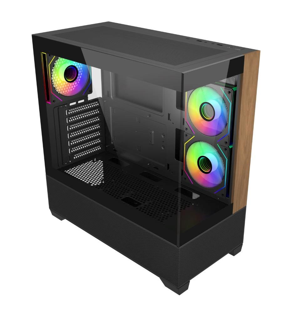 Popis Cooler Master case Elite 690 Wood, ATX, Průhledná bočnice, 3x 120mm ARGB Fan, Černá