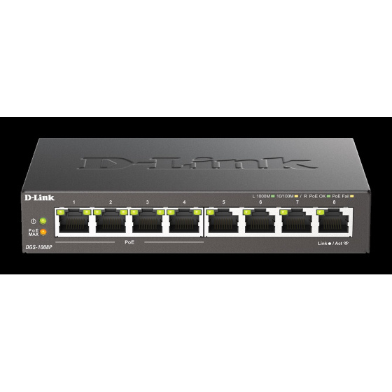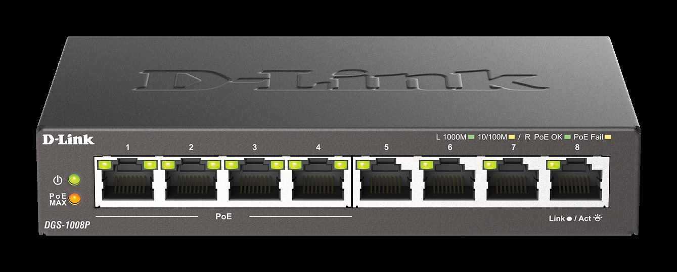 D-Link DGS-1008P 8-portový gigabitový stolový prepínač, 4 porty PoE+, rozpočet PoE 68 W