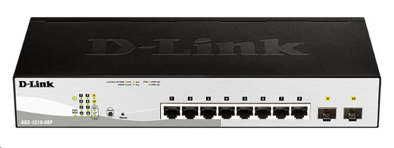 D-Link DGS-1210-08P 10-portový gigabitový inteligentný PoE switch, 8x GbE PoE+, 2x SFP, PoE 65W, bez ventilátora