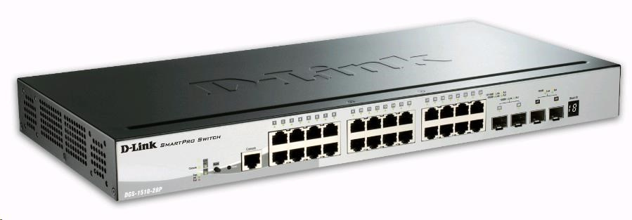 D-Link DGS-1510-28P 28-portový gigabitový stohovateľný SmartPro PoE switch, 24x gigabitový RJ45, 2x 10G SFP+ port, 2x SFP port