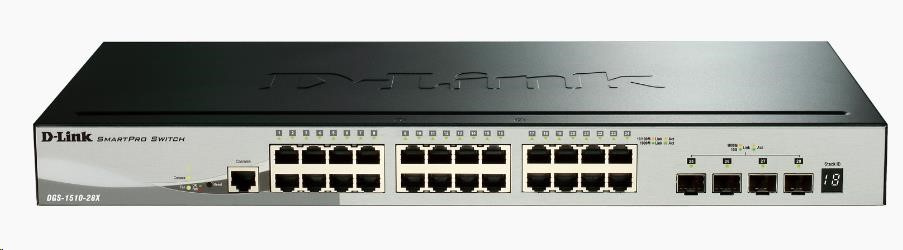 D-Link DGS-1510-28X 28-portový gigabitový stohovateľný inteligentný riadený prepínač, 24x gigabit RJ45, 4x 10G SFP+