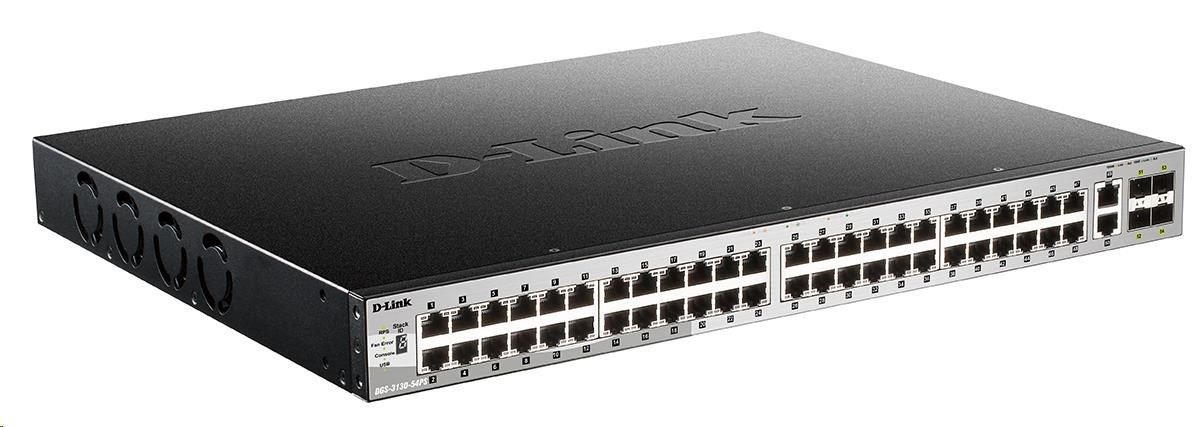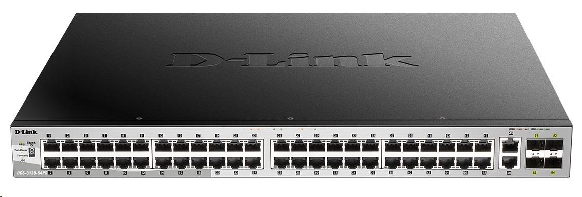 Popis D-Link DGS-3130-54PS/SI L3 Stohovateľný riadený gigabitový PoE switch, 48x PoE gigabit, 2x 10GBASE-T, 4x SFP+, 370W PoE