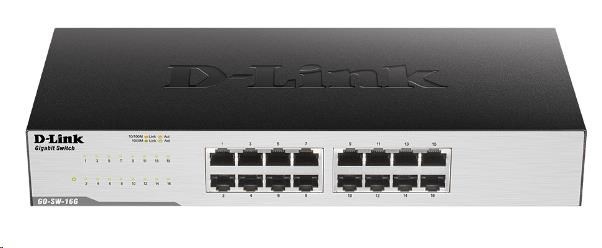 16-portový GIGABIT EASY DESKTOP SWITCH - 16-portový gigabitový prepínač - Auto MDI.MDIZ crossover pre všetky porty - Full/half-duplex pre rýchlosti Ethernet / Fast Ethernet - Plug-and-play inštalácia - Energy Star Level V kvalifikácia - D-Link Green (automatické vypnutie nepoužívaných portov) - Kovové puzdro, čierne, Desktop a Rackmount (gumové nožičky a Rackmount kit súčasťou balenia), 1 HE..