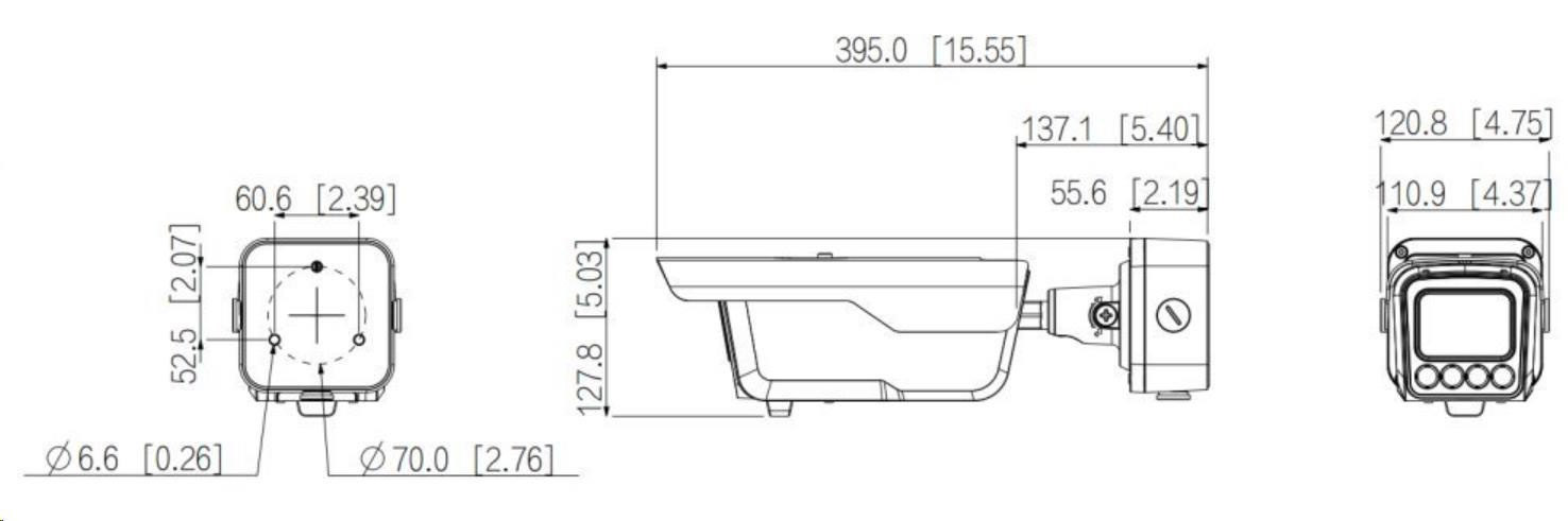 1/1,8" CMOS 4 Mpx snímač, rozlíšenie 2688 × 1520 pri 25/30 fps, P-iris riadená clona, IR osvetlenie do 60 m, 1× GbE LAN, RS-485 pripojenie, microSD slot (TF karta) pre kartu do 256 GB, vodeodolnosť podľa IP67 a odolnosť proti vandalizmu podľa IK10, prevádzková teplota -30 až +65 °C, napájanie DC 12 V alebo PoE (802.3at) 44–57 V.