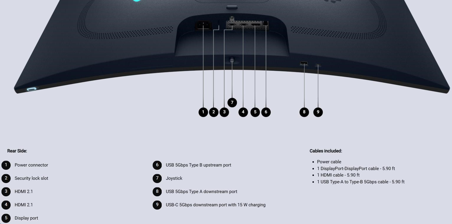 | 1. | Video port - 1 DisplayPort 1.4 (HDCP 1.4 & 2.3) port (Podporuje až 3440 x 1440, 240 Hz, DSC, HDR)