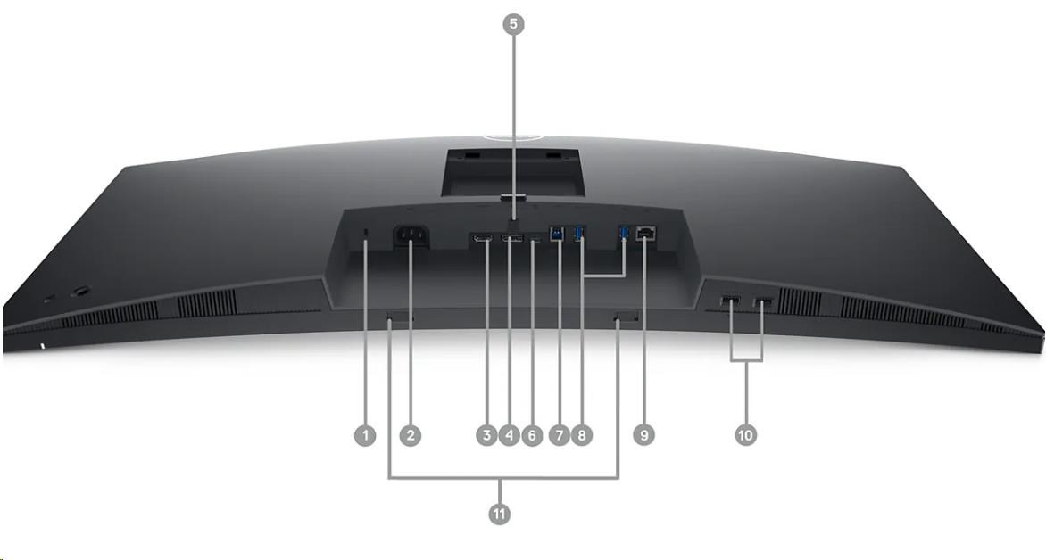 | 1. | 1. Slot na bezpečnostný zámok (základ na KensingtonSecurity Slot™) 2. Napájací konektor 3. HDMI port 4. DisplayPort 5. Funkcia zámku stojana 6. USB Type-C port 7. SuperSpeed USB 5 Gbps (USB 3.2 Gen1) upstream port typu B 8. SuperSpeed USB 5 Gbps (USB 3.2 Gen1) downstream porty typu A (4) 9. RJ45 port 10. Sloty pre soundbar |