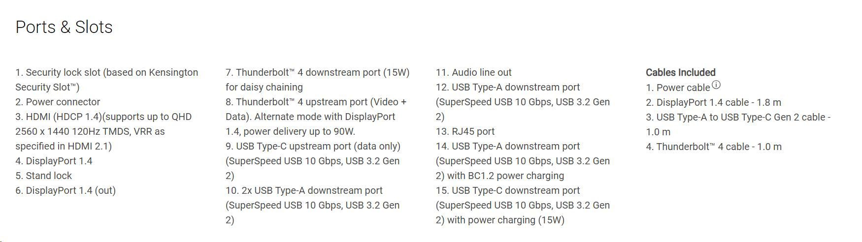 • 1 x ThunderboltTM 4 upstream port (Video + Dáta). Alternatívny režim s DisplayPort 1.4, napájanie do 90W.