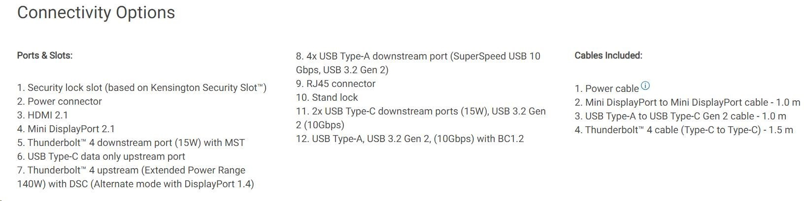 | 1. Power cable 2. Mini DisplayPort to Mini DisplayPort cable - 1.0 m 3. USB Type-A to USB Type-C Gen 2 cable - 1.0 m 4. Thunderbolt™ 4 cable (Type-C to Type-C) - 1.5 m |