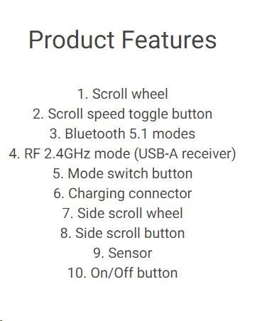 | Vertical and horizontal scrolling, rechargeable battery, thumb rest, fast scrolling, track-on-glass sensor |