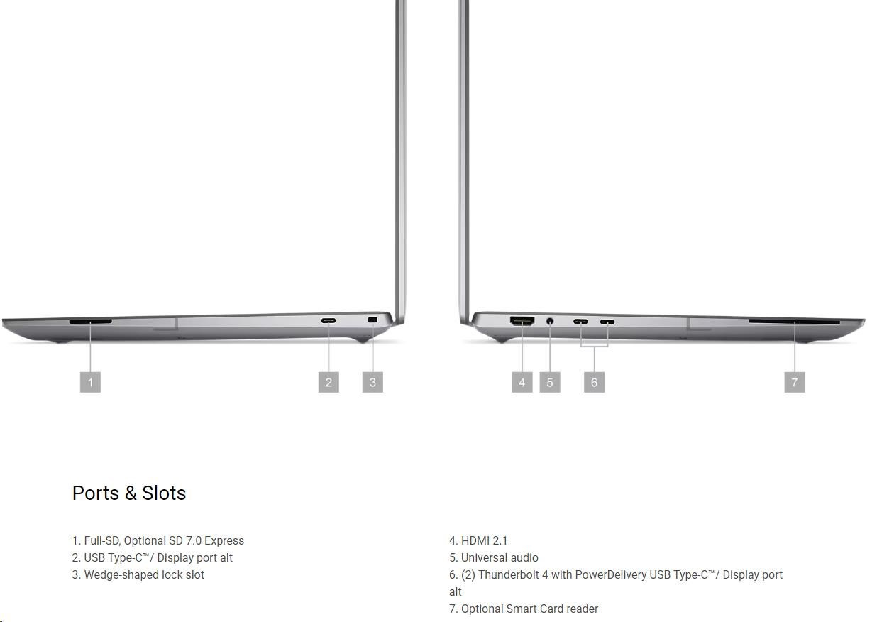 | Full-SD, Optional SD 7.0 Express USB Type-C™/ Display port alt Wedge-shaped lock slot HDMI 2.1 Universal audio (2) Thunderbolt 4 with PowerDelivery USB Type-C™/ Display port alt Optional Smart Card reader |