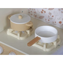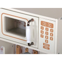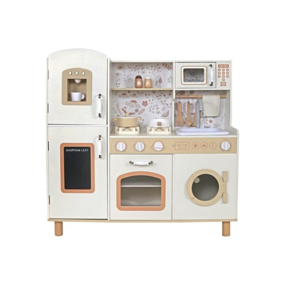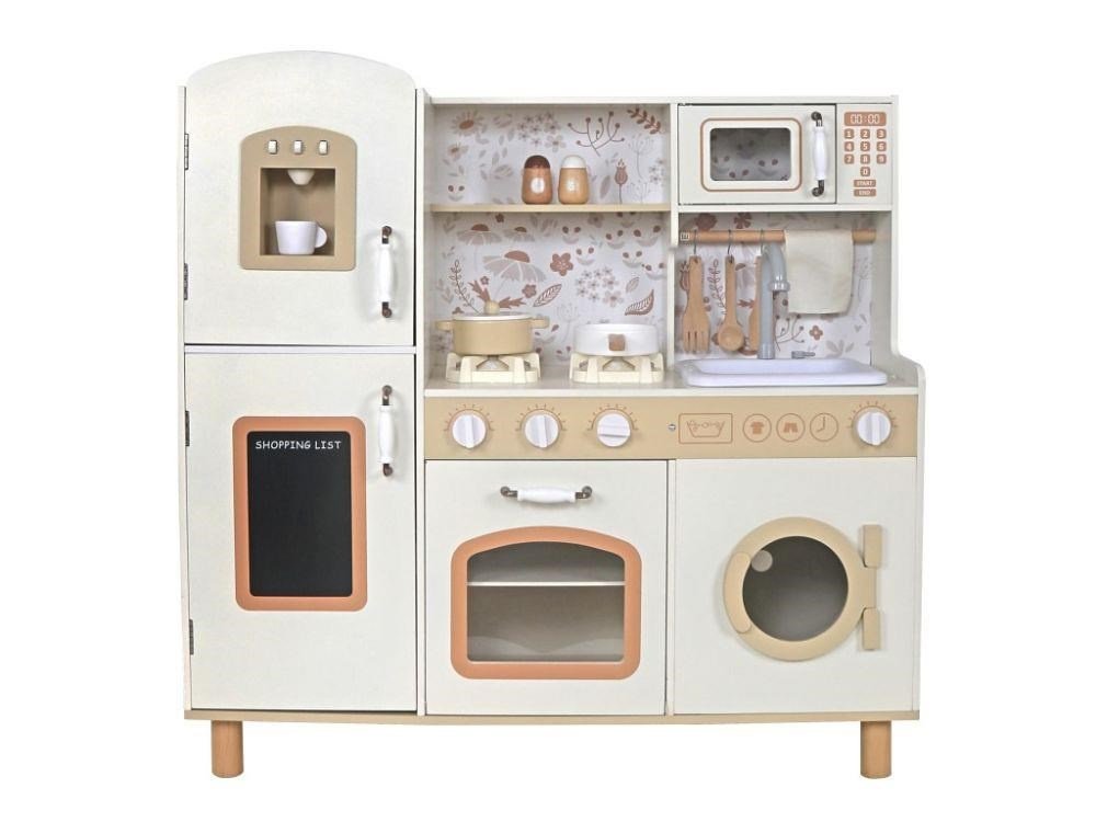 Detská kuchynka v svetlých farebných tónoch, ozdobená kvetmi, je štýlovou edukatívnou hračkou pre deti od 3 rokov veku. V drevenej kuchynke s modernými spotrebičmi a tečúcou vodou si deti uvoľnia svoju fantáziu, môžu variť, piecť a zohrievať jedlá, variť kávu a pokojne vyprať špinavé bielizeň. Jednoducho si vyskúšajú dospelácke činnosti bezpečným detským spôsobom. Reálny nádych celej hre dodajú zvukové efekty, ktoré vydáva sporák alebo vodovodná batéria.