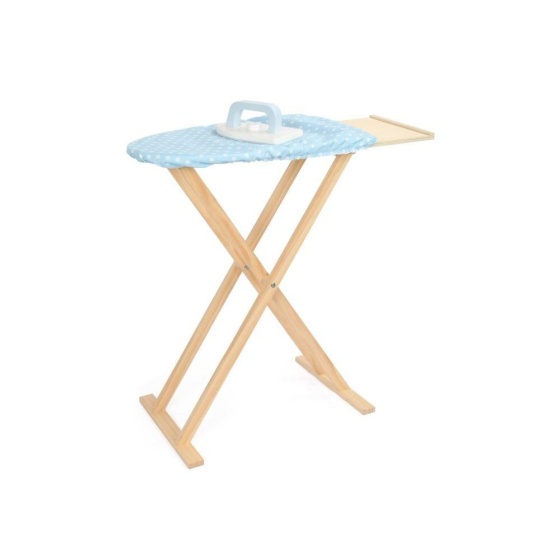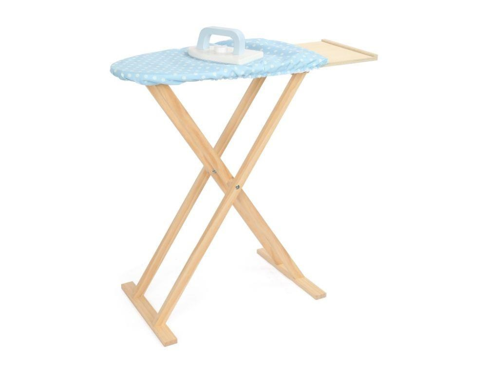 Drevené detské žehliace prkno s drevenou žehličkou a látkovým poťahom na prkno je originálna edukačná hračka, ktorá umožní deťom vyskúšať si jednu z dospeláckych činností bezpečným detským spôsobom. O drevenú žehličku sa deti určite nespália, vyskúšajú si žehlenie aj poskladať vyžehlené prádlo. Hračka zdokonaľuje detské zručnosti a umožňuje deťom hrať role.