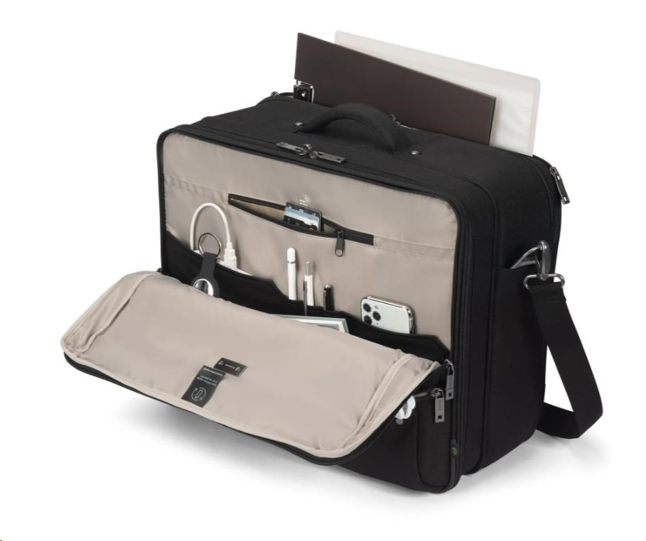 MULTI TWIN FIVE je bezpečný, funkčný a ekologický spoločník na každodenné pracovné potreby. Uzamykateľná priehradka na notebook s penou HDF poskytuje robustnú ochranu, zatiaľ čo vnútorná priehradka na tablet zabezpečuje, že menšie zariadenia sú rovnako bezpečné. V vyhradenej zadnej priehradke sú usporiadané dokumenty, zatiaľ čo predná časť ponúka štruktúrované kapsy na príslušenstvo. Táto taška, premyslene navrhnutá pre pohodlie, je navyše vyrobená zo 41 recyklovaných PET fliaš, čo spája udržateľnosť s každodennou praktickosťou.