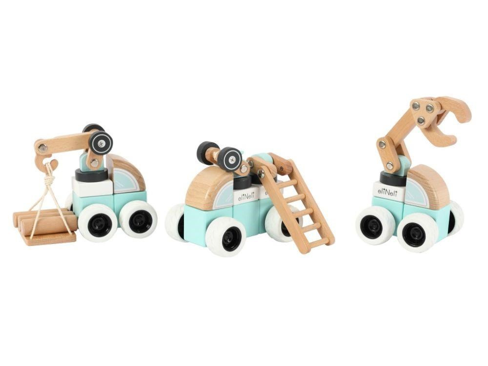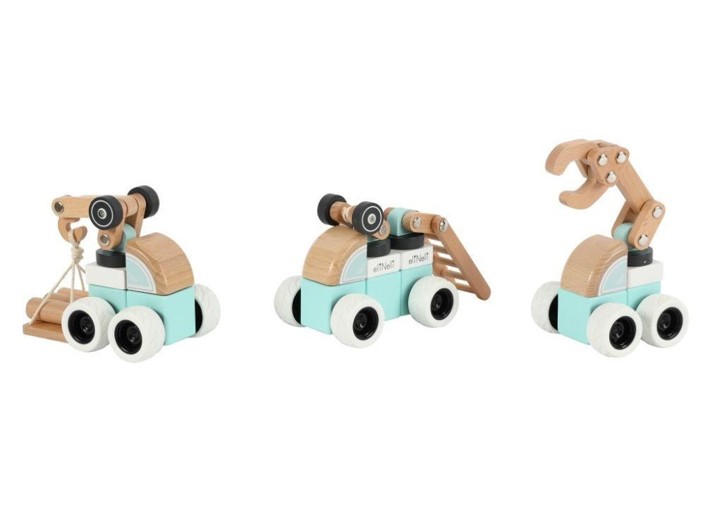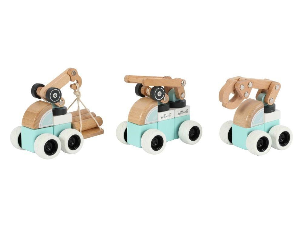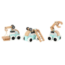 Sada drevených áut (strojov) ponúka množstvo možností na hranie. Každé auto je zostavené z kostiek v farbe bielej, mätej alebo v prírodnej farbe dreva a každé z áut obsahuje pohyblivú časť (pohybové rameno alebo rebrík) pre ešte viac zábavy. Auta sú vyrobené tak, aby dobre padli do detskej ruky, pohodlne sa držali a ľahko s nimi manipulovalo. Gumené kolesá tlmia hluk a šetria podlahu.
