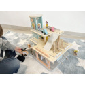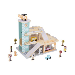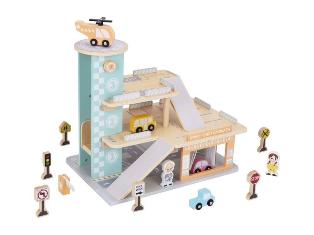 Garáž na autíčka s myčkou, v krásnych jemných farbách, prinesie deťom veľa zábavy. Súčasťou 3-poschodovej drevenej garáže je parádna myčka áut, tankovací stojan, výťah, helipad i množstvo parkovacích miest pre autíčka. Bohaté príslušenstvo v podobe helikoptéry, autíček, dopravných značiek a obsluhy garáže umožní, aby si s garážou pre autíčka vyhralo vaše dieťa samo alebo so svojimi kamarátmi.