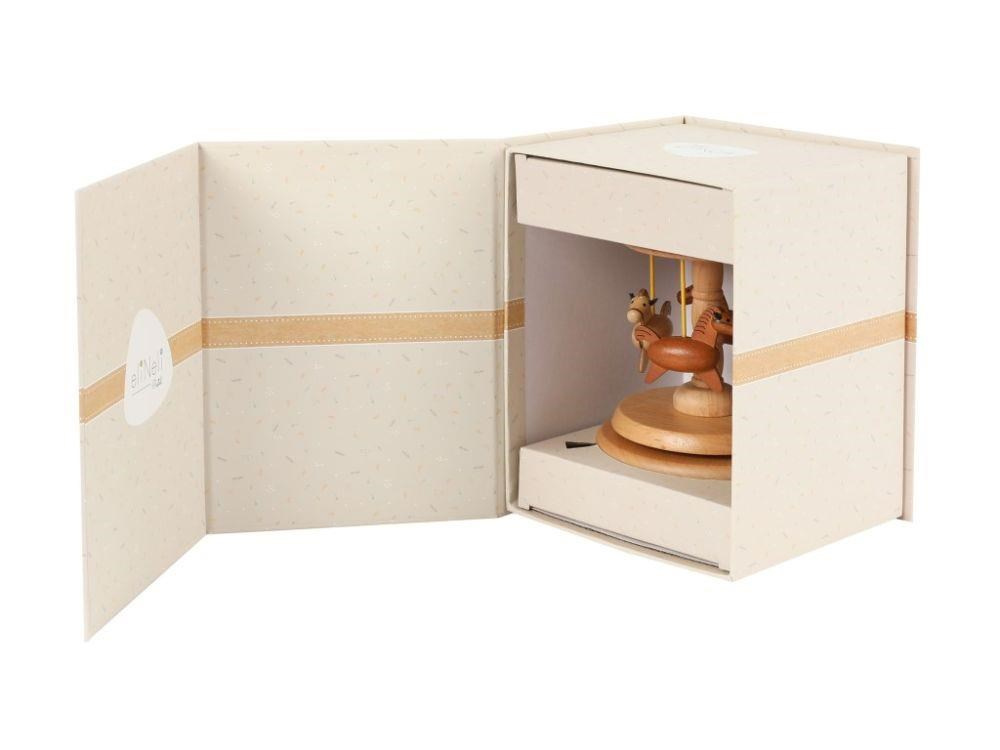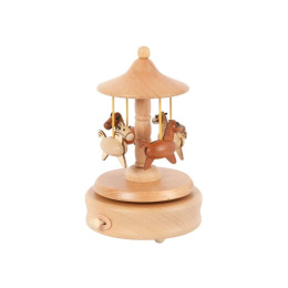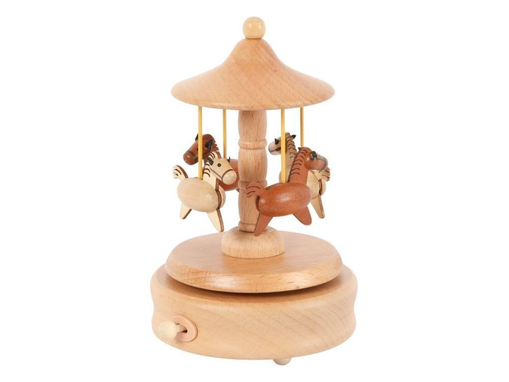 Drevená hracia skrinka s koňmi je hudobná hračka aj krásnou dekoráciou. Hrajúci kolotoč s koňmi, ktorí sa točia dokola, je vyrobený z prírodného dreva, jeho povrch je do hladka opracovaný, príjemný na dotyk. Drevená skrinka poteší každú malú aj veľkú milovníčku koní, je krásnou dekoráciou na poličku, stôl, krásnym darčekom ku každej príležitosti.