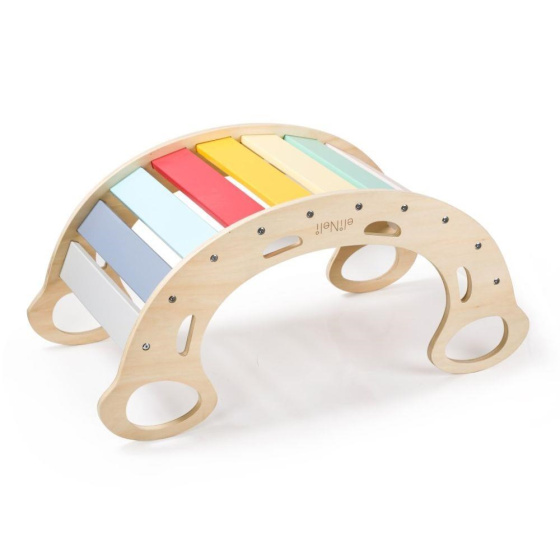 Vylepšená multifunkčná drevená hojdačka 5v1, s doskami v sviežich fresh farbách, je zábavnou hračkou pre deti, ktorú využijú pri pohybových aktivitách aj pri hre. Montessori hojdačka umožní deťom príjemne sa pohupovať, skvele poslúži ako lezenie, skluzavka, skrýša, most, stolička alebo predajný pultík pri hre na obchod. Hojdačka prirodzeným spôsobom rozvíja motorické zručnosti a je vhodná pre deti už od 1 roka.