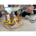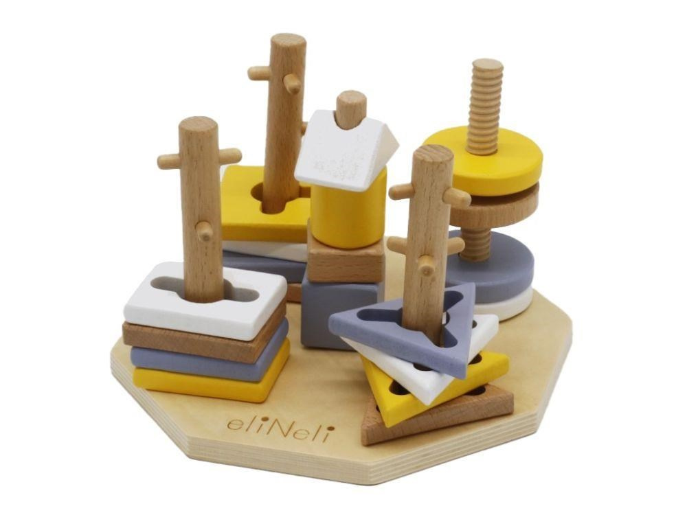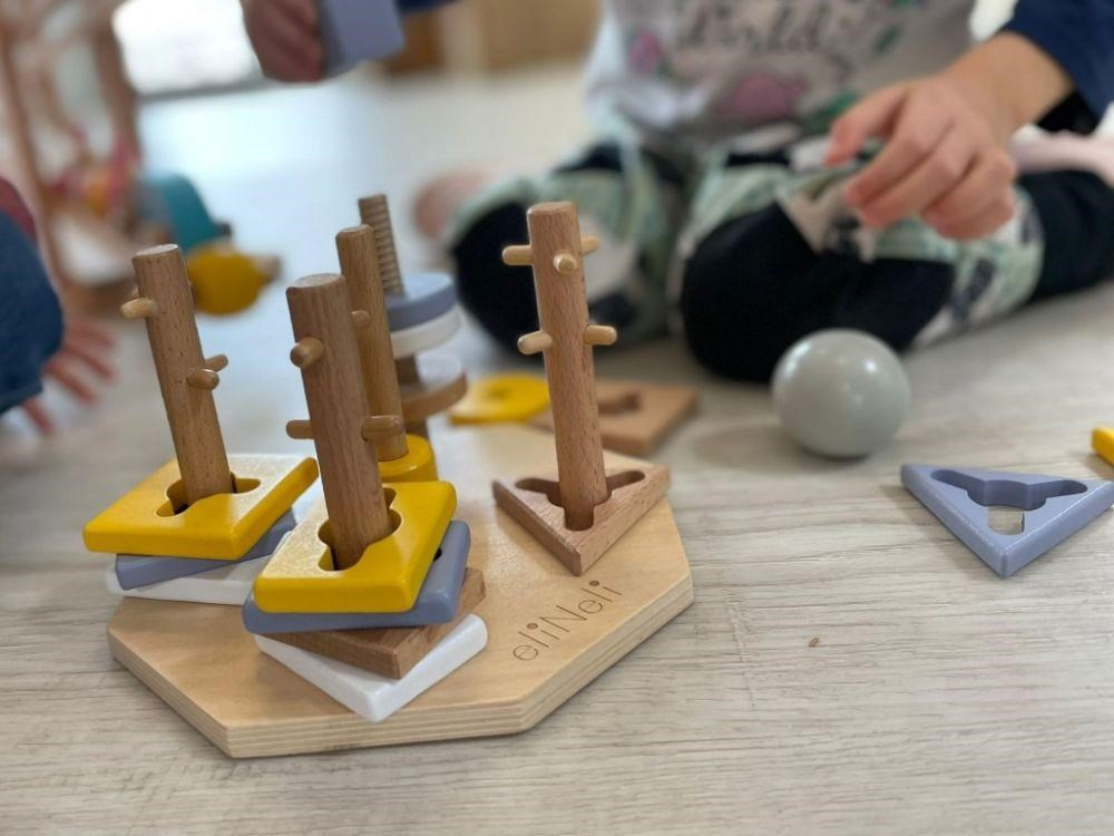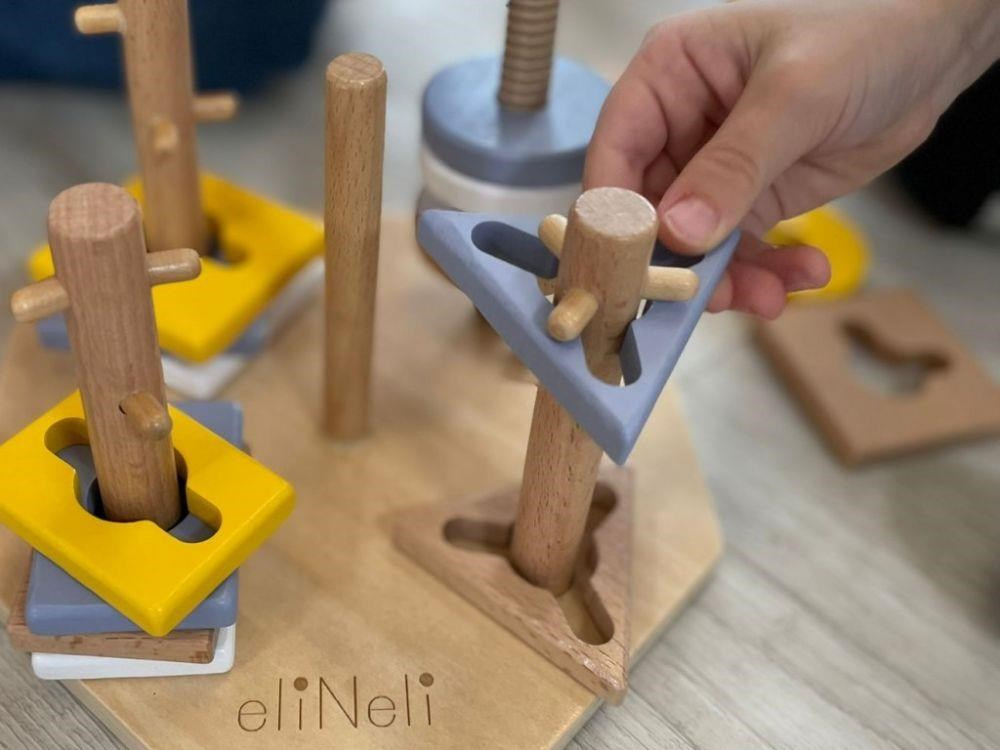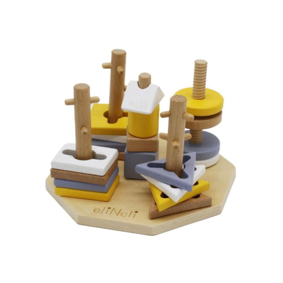 Navlékacie tvary v krásnych neutrálnych farbách deti nasadzujú na drevené kolíky, ktoré však nie sú úplne hladké a deťom navliekanie sťažujú rôznymi výstupkami. Niekedy táto hra vyžaduje veľa trpezlivosti.