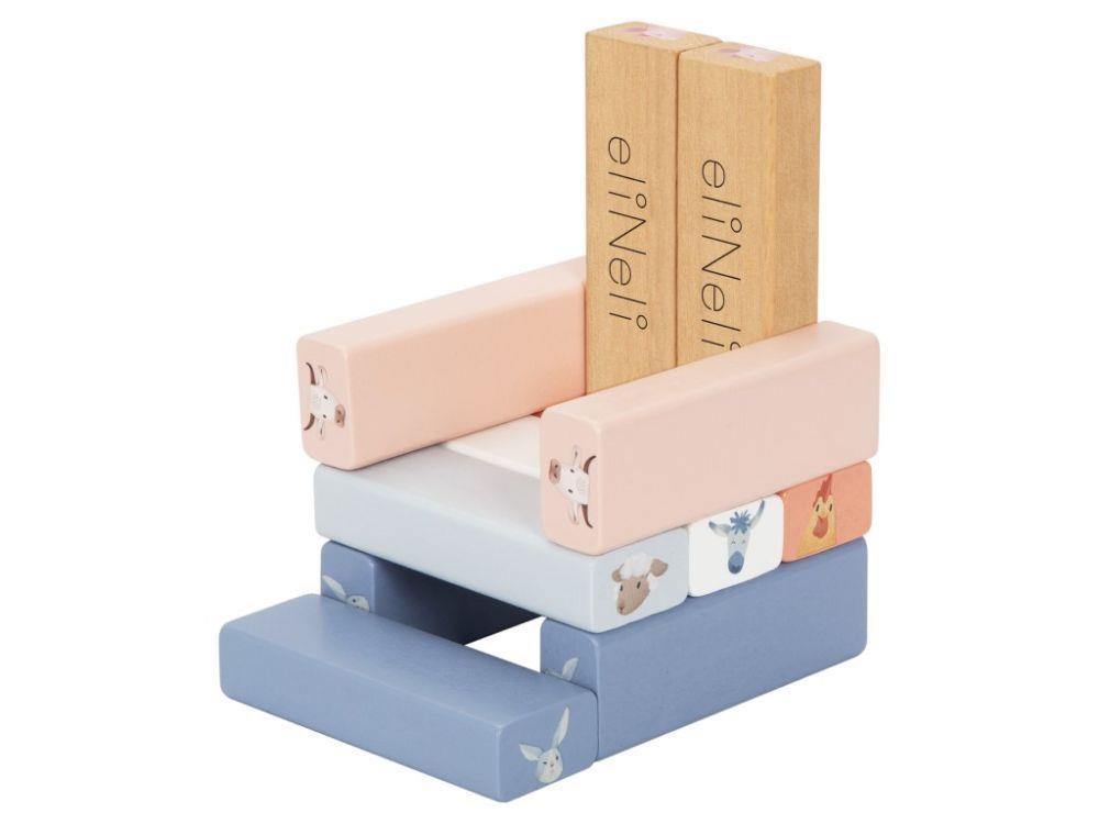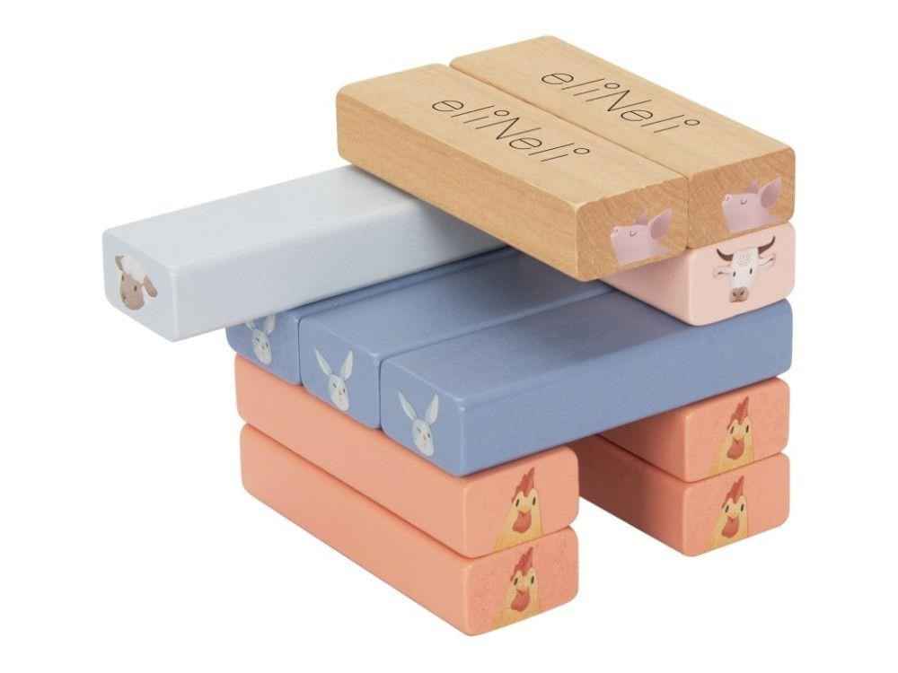 Drevená skladacia veža Jenga v príjemných pastelových farbách, s motívom zvieratiek z farmy, s bohatým príslušenstvom, je zábavnou hrou pre deti aj celú rodinu. Skladacia veža ponúka veľa možností na hru s rôznou úrovňou obtiažnosti. Tieto najmenšie deti sa hrám s drevenými kockami, väčšie deti postavia vežu a pokúsia sa vytiahnuť kocky s motívom zvieratka, ktoré padlo na kocke alebo si vylosovali z kartičiek a tí najväčší šikulovia môžu kocky z veže vytĺkať kladivkom.