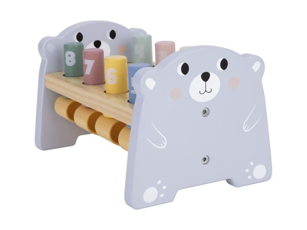 Zatláčačka pre deti je klasická drevená hračka, ktorá poteší každé dieťa. Drevená zatláčačka v krásnych farbách, s roztomilým medvídkom, s očíslovanými valčekmi a malou vychytávkou rozvíja detské zručnosti, naučí deti spoznávať farbičky aj číslice.