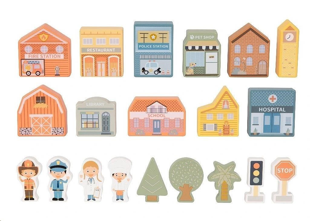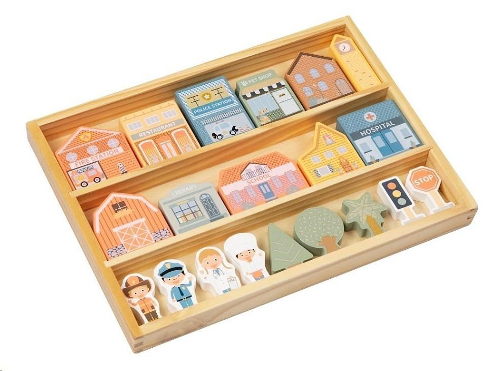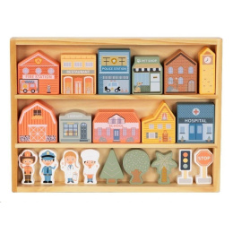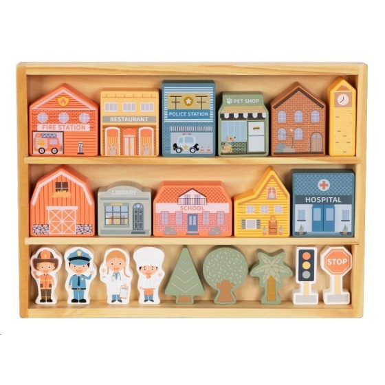 Drevené kocky patria medzi najobľúbenejšie drevené hračky. S kockami môžu deti popustiť uzdu svojej fantázii, hrať sa a stavať cesty, domčeky aj celá mesta. S drevenými kockami mesto vybudujú deti úžasné mesto s nemocnicou, policajnou a hasičskou stanicou, so školou, knižnicou, obchodíkmi, obytnými domami a večne zelenými stromami raz-dva. Na dodržiavanie poriadku dohliadne postavička policajta, o chorých sa postará pán doktor a pre prípad požiaru v meste nechýba ani ďalší hrdina - hasič. Drevené kocky krásne uložené v praktickej krabičke si deti ľahko prenesú na miesto, kde si s nimi chcú hrať, môžu si ich vziať so sebou na návštevu, na víkend k starým rodičom či na dovolenku.