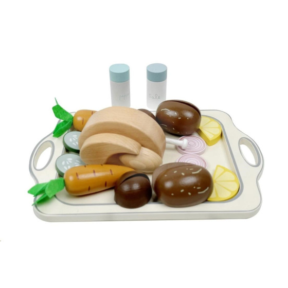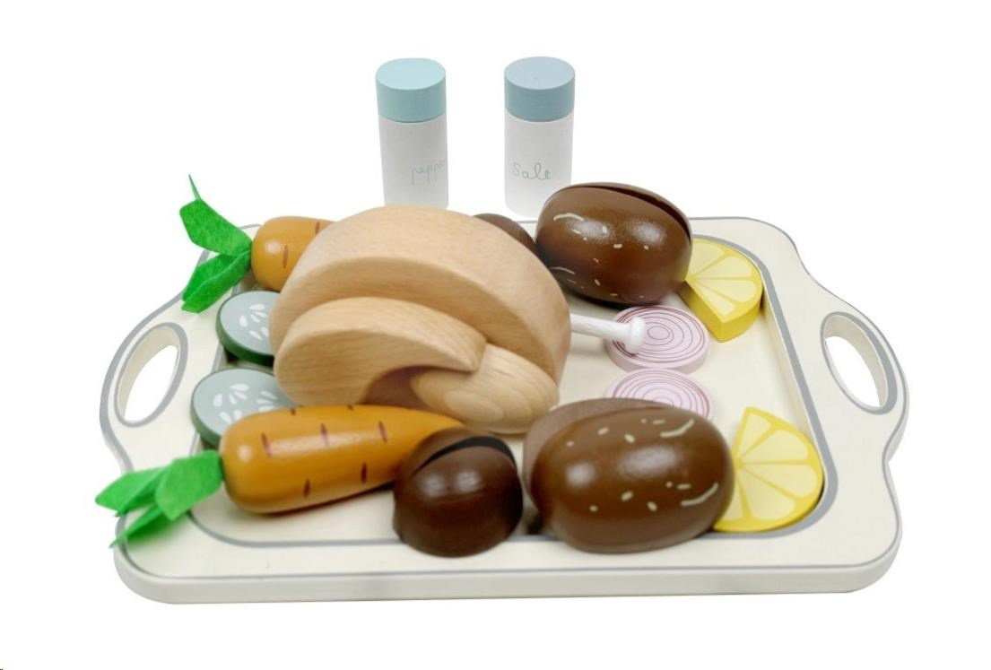 Drevená sada potravín so zeleninou, kurčaťom, solničkou, korením a veľkým podnosom (táckom) je skvelým doplnkom do detskej kuchynky. S touto sadou bude príprava (pečenie) kurčaťa hračkou a veľkou zábavou. Drevené kurča stačí obložiť obľúbenou zeleninou a prílohami, osoliť, okoreniť a vložiť do rúry, ktorá je súčasťou detskej kuchynky vašej dievčatko alebo chlapca. Teraz už len pohlídať, aby sa kurča nespálilo a chutné vyzerajúce jedlo je pripravené na podávanie. S touto originálnou sadou drevených potravín si deti vyskúšajú prípravu obeda bezpečným detským spôsobom, zdokonalia motorické zručnosti a manuálnu zručnosť, pustia uzdu svojej fantázii, pridajú sa do roly kuchára, mamičky, otecka a užijú si veľa zábavy. Na natieranie sa používajú vodou riediteľné farby, vhodné a bezpečné pre deti.