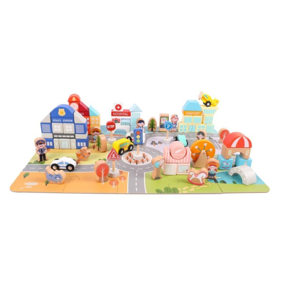 Parádna sada kostiek Metropole umožní deťom vybudovať mesto so všetkým všudy priamo v ich detskej izbe. Sada 104 ks drevených kostiek rôznych tvarov, s autíčkami, postavičkami a dopravnými značkami zabezpečí deťom zábavu a ešte im niečo nové priučí. Na puzzle podložke s cestou, jazierkom a zeleňou si deti postavia nemocnicu, letisko, policajnú a hasičskú stanicu a ďalšie budovy - mesto, ktoré môže mať veľa podôb.