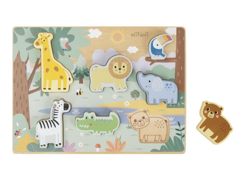 Vkládacie puzzles pre deti s obľúbenými zvieratkami - žirafou, zebrou, levom, krokodýlom, medveďom, slonem a tukanom, zaviedie deti do ZOO. S drevenou hernou doskou a drevenými puzzle dielikmi v podobe zvieratiek si deti precvičia motorické zručnosti, koordináciu oko, logické myslenie, naučia sa trpezlivosti a sústredenia.