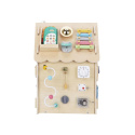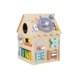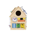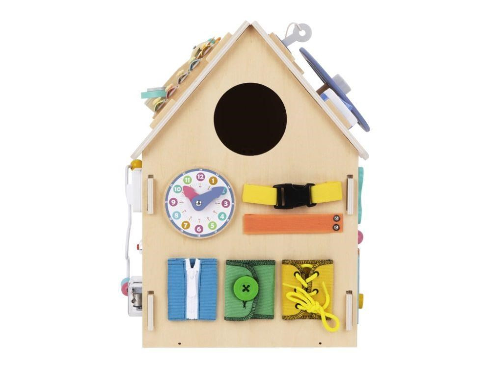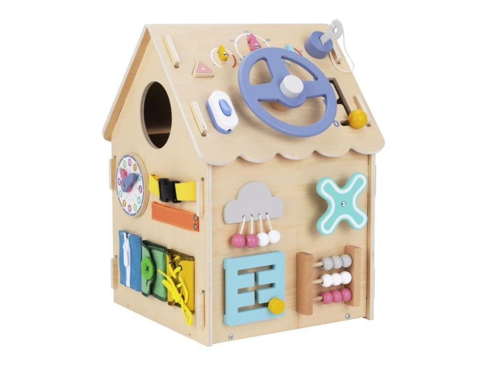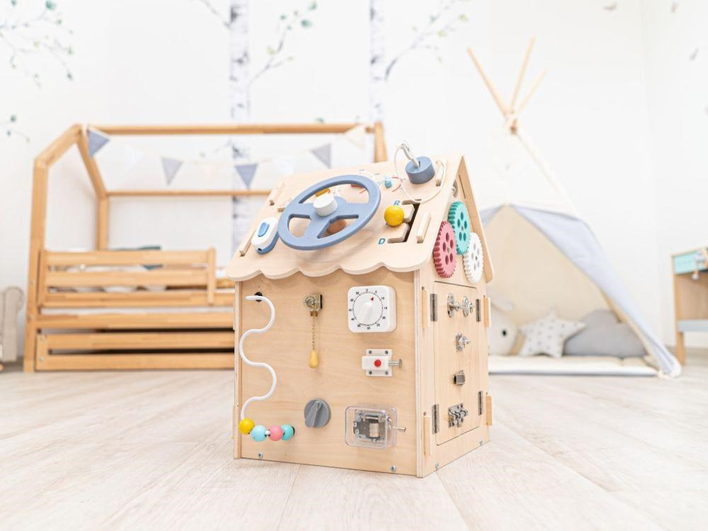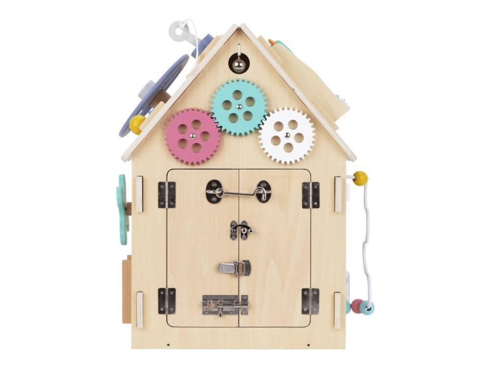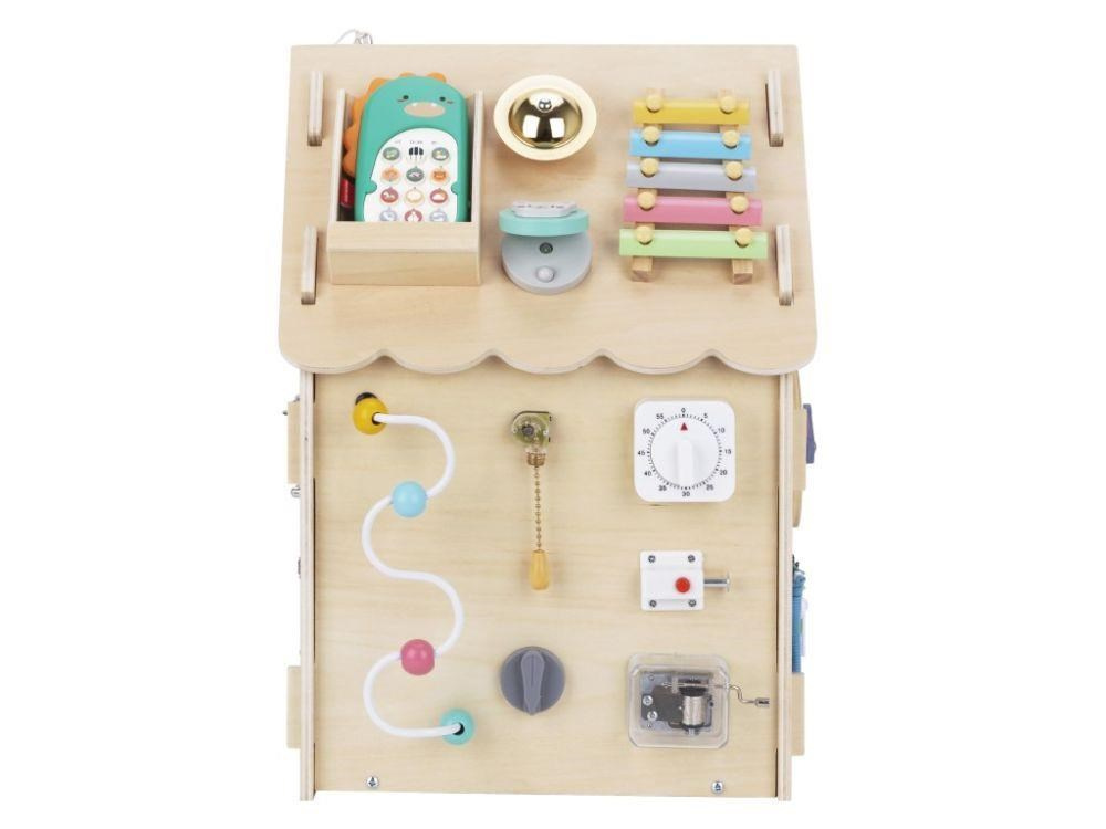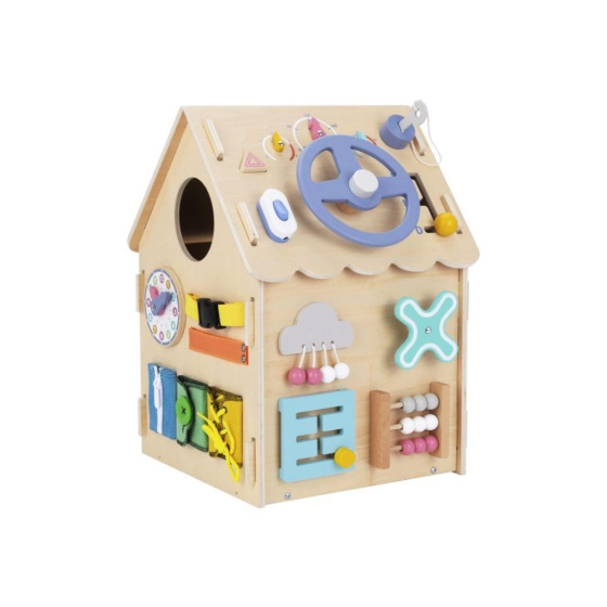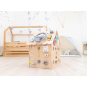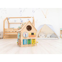 Domeček activity board v prírodnom (natur) prevedení, s montessori a hracími prvkami, s volantom a ďalšími zaujímavými doplnkami láka deti k preskúmaniu, ku hre a k učeniu sa. Drevený activity board domeček je hracou a zároveň výukovou pomôckou. Pri hre deti prirodzeným spôsobom zdokonaľujú svoje schopnosti, učia sa novým veciam a užijú si veľa zábavy.