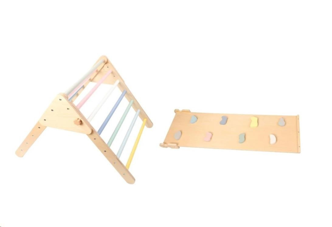 Montessori Piklerové trojuholník v sete s obojstrannou doskou 2v1 (lezeckou stenou a šmýkačkou v jednom) je šplhacia pomôcka - detská preliezačka do interiéru, ktorá ponúka nesčíselné možnosti na hranie i športové aktivity. Vďaka malému domácemu ihrisku, vyrobenému z kvalitného prírodného dreva, si deti užijú veľa zábavy a zdravého pohybu aj za nepriaznivého počasia, pokojne priamo v ich detskej izbe.
