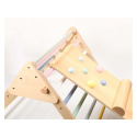 S pastelovým setom Piklerové trojuholníku s montessori obojstranným doskou (skokanka, lezecká stena, stezka bosou nohou, balančná doska) ľahko vytvoríte detské ihrisko priamo u vás doma. Piklerové trojuholníkový set v kombinácii prírodného dreva a pastelových farieb motivuje deti k preskúmaniu, objavovaniu svojich možností, odvahe a k pohybu. Deti pri šplhaní, preliezaní, lezení a kĺzani si precvičia celé telo a ešte si užijú veľa zábavy. Preliezačka je vybavená systémom proti prevráteniu tyčí, bezpečnostným skrutkou a samozrejmosťou sú obrusovaný povrch a hrany.