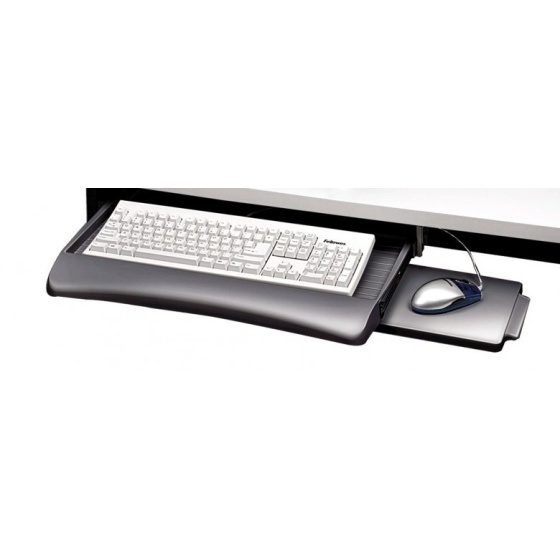 Predchádzajte bolesti zápästia pomocou držiaka klávesnice a myši Fellowes. Jeho inštalácia pod stôl alebo bežnú dosku stola poskytuje ďalší využiteľný priestor. Vhodné do kancelárie aj do domácnosti. Uľahčuje organizáciu vecí na stole. Nastaviteľná výška - 3 možné polohy, podložku pod myš možno inštalovať zľava alebo sprava, moderný dizajn, veľkosť priestoru pre klávesnicu 515 × 240 mm, veľkosť podložky pod myš 200 × 165 mm, farba grafitová, materiál plast, rozmery (dxvxh) 515 - 715 × 63 - 84 × 300 mm...