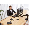 Držiak monitoru a klávesnice NB NB35 Profesionálny stolný držiak na monitor 17-30" s poličkou na klávesnicu 560x200mm, výškovo nastaviteľný +/-480mm, naklápanie +12°/-15°, otáčanie +/-180°, pivot, možnosť vysunutia a zaklopenia police, priehradka, 2x USB 3.0 porty, práca v sede aj v stoji, VESA 75x75 a 100x100, nosnosť 9kg Univerzálny stolný držiak na monitor 17-30" a klávesnicu pre ergonomické kancelárie, ktorý Vám umožní kedykoľvek zmeniť pozíciu pre prácu ako v sede, tak aj v stoji. Zmena polohy je veľmi ľahká a rýchla, bez použitia akýchkoľvek nástrojov alebo zložitých nastavovaní - počas okamihu zmeníte výšku až o 480mm. Na držiak je možné uchytiť všetky typy monitorov s VESA štandardom 75x75 alebo 100x100. Držiak umožňuje ľahké kompletné nastavenie podľa potreby - otáčanie do strán, výškovo nastaviteľnosť, náklon obrazovky, posun a náklon police, vzdialenosť od stolového uchytenia, korekcia roviny. Kvalitný duálny úchyt na zabezpečenie na okraji stolu a perfektná fixácia. Profesionálna kvalita, vynikajúce spracovanie, pekný dizajn a veľmi jednoduché nastavenie. Farebné prevedenie čierne. Profesionálny polohovateľný držiak monitora a klávesnice na prácu v sede aj v stoji NB NB35 Technické údaje: maximálne zaťaženie 9kg minimálne zaťaženie 2kg podporuje VESA štandardy 75x75 a 100x100 možnosť rozšírenia VESA štandardu na 200x100 alebo 200x200 ideálny na monitory a televízory s uhlopriečkou 17-30" otáčanie do strán +/- 180° náklon monitoru -12° / +15° funkcia pivot - možnosť polohy monitora na šírku alebo na výšku maximálna výška 950mm od stolovej dosky maximálna dĺžka od uchytenia 1020mm celkové výškové nastavenie +/- 480mm úprava výšky samotného monitora na držiaku 100mm polica na klávesnicu s rozmermi 560x200mm možnosť vysunutia police +/- 60mm, naklopenie +/- 12°, možnosť úplného zaklopenia uchytenie na okraj stola, duálny úchyt, na dosky o hrúbke 20-90mm 2x USB 3.0 port farebné prevedenie čierne profesionálna kvalita, jednoduchá polohovateľnosť záruka 3 roky Pracovná stanica - polohovateľný držiak na monitor a klávesnicu pre voľbu, či chcete pracovať v sede alebo v stoji NB NB35. Polohovateľný držiak na monitor aj klávesnicu, výškové nastavenie pre možnosť práce v sede alebo v stoji, jednoduché a rýchle polohovanie - Fiber Mounts NB35 Držiak podporuje VESA štandardy: VESA 75x75 VESA 100x100