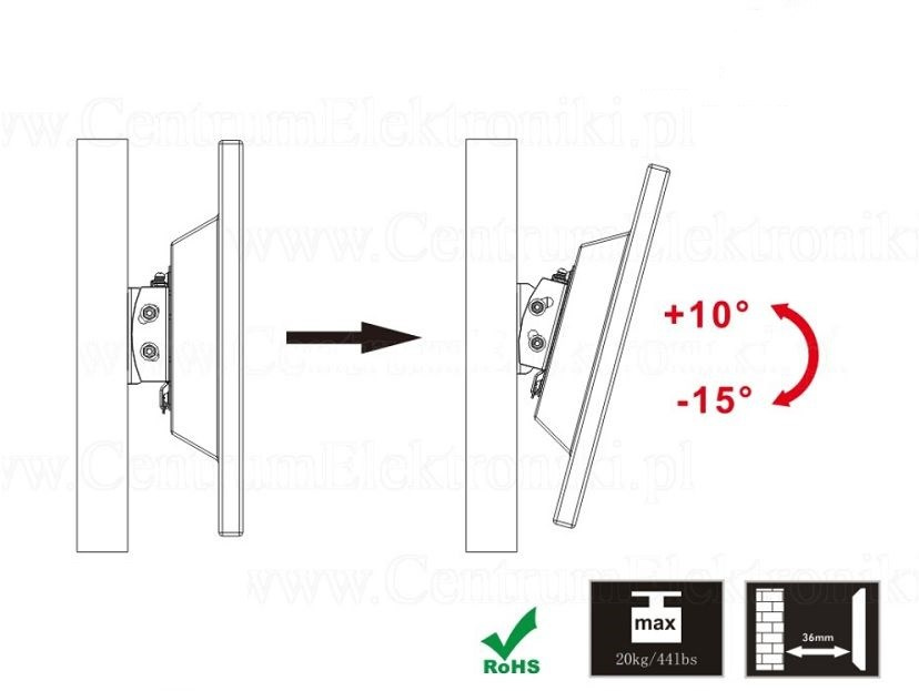 Nástenný držiak na monitory a menšie televízie 13-30", ktorý umožní nastavenie náklonu obrazovky +10°až -15°. Zavešenie monitoru alebo TV je veľmi jednoduché a rýchle, rovnako tak aj samotná inštalácia držiaka na stenu. Držiak podporuje VESA štandardy 75x75 a 100x100, nosnosť 20kg. Farebné prevedenie čierne, záruka 5 rokov.