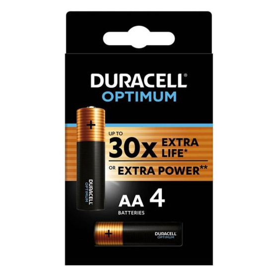 (BAL:4/64ks) Alkalické batérie Duracell Optimum AA (LR6) v balení po 4 kusoch sú vhodné pre každodenné použitie. Batérie sa stali nevyhnutnou súčasťou každej domácnosti, kde napájajú mnoho elektronických zariadení, ako sú hodiny, budíky, senzory, lampy, dálko