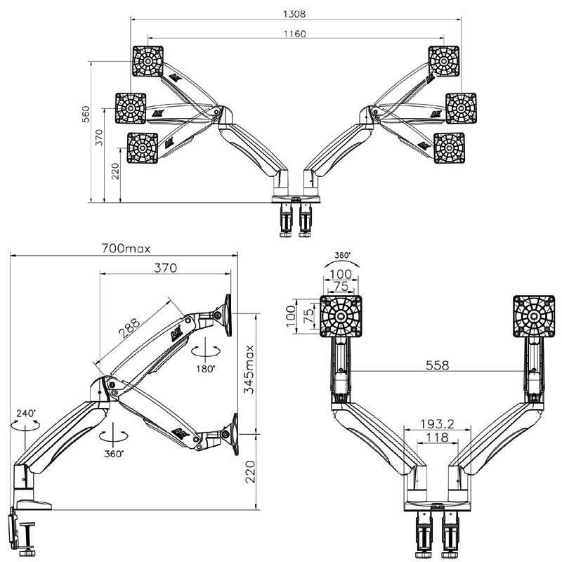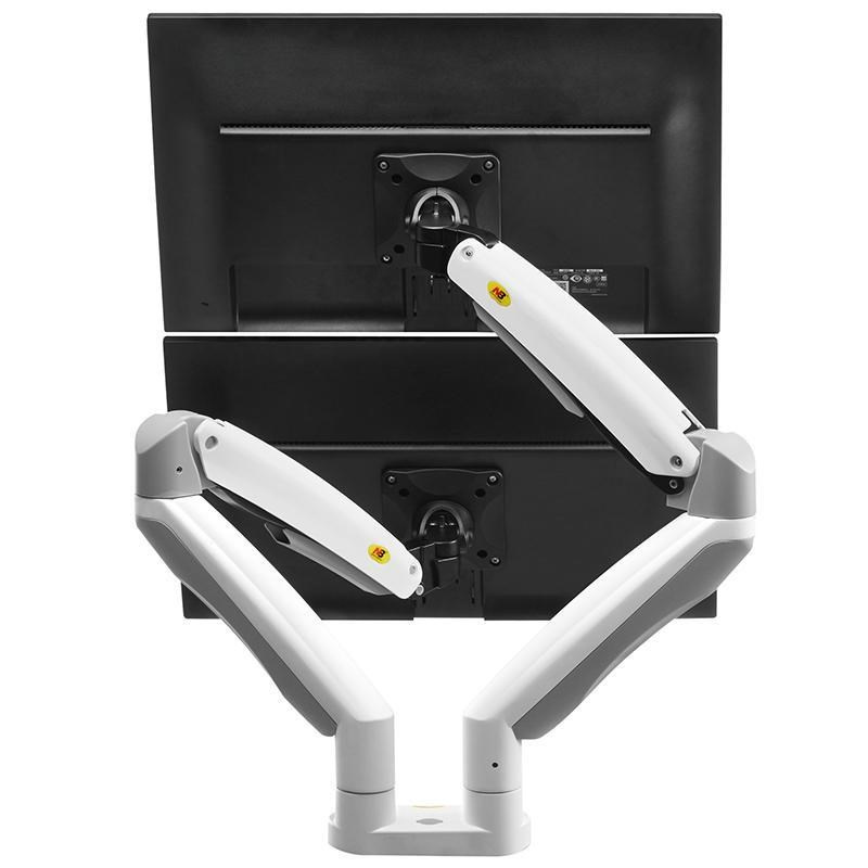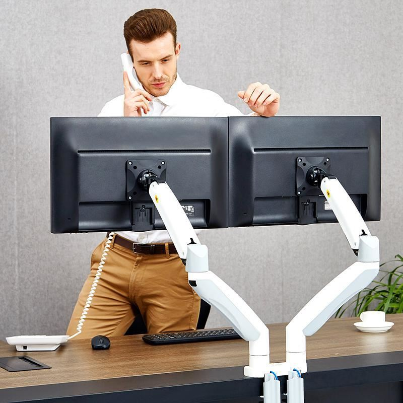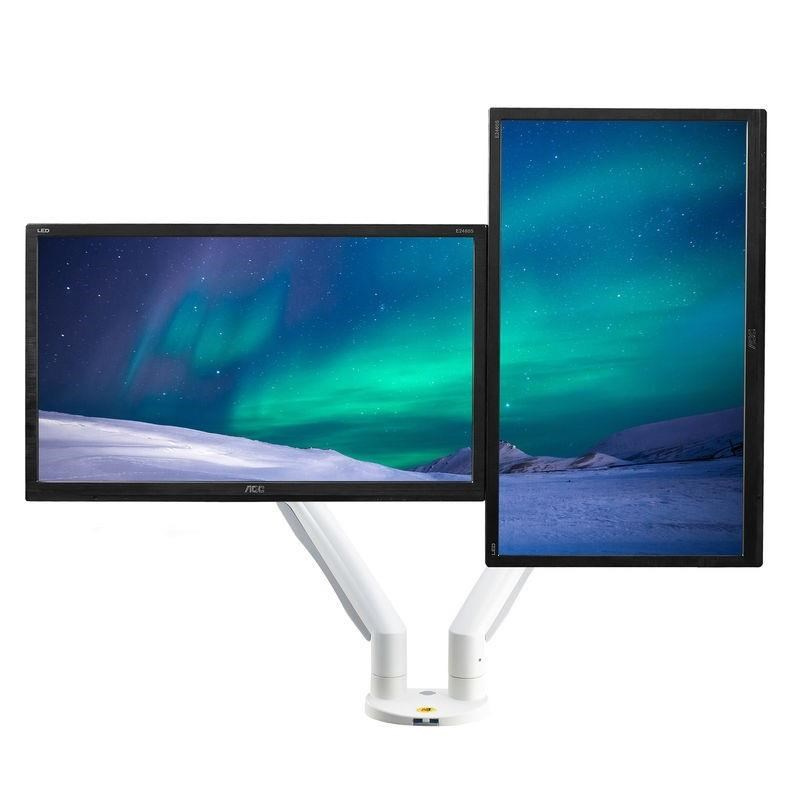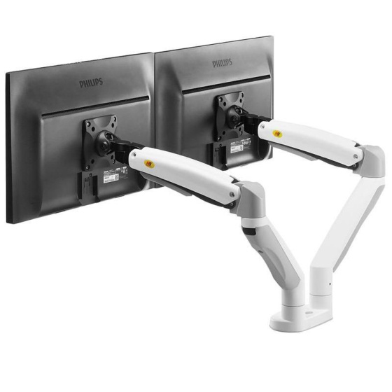 Dvoumonitorový stolný držiak NB F195AW Profesionálny stolný držiak na 2 monitory 21-32", 3D nezávislé nastavenie polohy, biele prevedenie, profesionálna kvalita Špičkový stolný držiak na zavesenie 2 monitorov a ich nezávislé nastavenie polohy: otáčanie do strán, nastavenie výšky, nastavenie vzdialenosti od stolového úchytu, náklon, rotácia obrazovky, korekcia roviny. Rôzne nastavenia polohy monitorov - vedľa seba na šírku, vedľa seba na výšku, pod sebou na šírku, alebo jeden monitor na šírku a druhý na výšku. Hmotnosť každého monitora musí byť v rozmedzí 3-9kg. Balenie obsahuje 2 typy úchytov na stolovú dosku, inštalačný materiál a návod. Farebné prevedenie biele. Záruka 3 roky. Biely držiak na dva monitory, polohovateľný, profesionálnej kvality, záruka 3 roky - Mounts F195AWProfesionálny biely držiak na 2 monitory, rôzne polohovanie monitorov, plne nastaviteľný držiak, TOP kvalita - Mounts F195AW Biely držiak na dva monitory, do kancelárie, pracovne, nemocnice, ambulancie. Top kvalita, jednoduché polohovanie. Držiak 2 monitorov Mounts F195AW Technické údaje: celková nosnosť 18kg hmotnosť každého monitora musí byť v rozmedzí 3 ÷ 9 kg podpora VESA štandardu 75x75 a 100x100 v prípade potreby za príplatok možnosť rozšírenia VESA na 200x100 alebo 200x200 odporúčaná uhlopriečka monitorov 21" až 32" nezávislé nastavenie výšky: min. 220mm, max. 565mm nezávislé otáčanie monitora do strán +/- 180° nezávislé naklonenie monitora +53° až -8° nezávislá rotácia monitora - otočenie monitora na šírku alebo na výšku, korekcia roviny nezávislé nastavenie vzdialenosti od stolového úchytu: 0mm až 700mm uchytenie na stolové dosky o priemere 10mm až 90mm balenie obsahuje 2 typy úchytov na stolové dosky (na okraj, do priestoru) 2x USB port vynikajúca kvalita, krásny dizajn jednoduché nastavenie polohy monitorov spoľahlivosť, bezpečnosť farebné prevedenie biele, strieborné alebo čierne záruka 3 roky Mounts F195AW - biely stolný držiak na nezávislé zavesenie a polohovanie dvoch monitorov Dvoumonitorový stolný držiak NB F195AW podporuje VESA štandardy: VESA 75x75 VESA 100x100 za príplatok rozšírenie na VESA 200x100 za príplatok rozšírenie na VESA 200x200 Biely držiak na dva monitory Mounts F195AW Veľmi pekný biely držiak na dva monitory, nezávislé polohovanie každého monitora, ľahká nastavenie, profesionálna kvalita a spracovanie. Ideálny držiak do moderných kancelárií, ambulancií, nemocníc alebo pracovní.