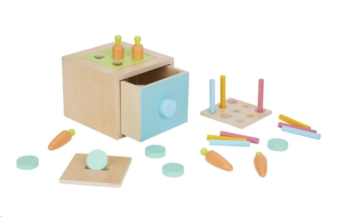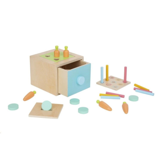 Drevená edukačná hračka (box), pre deti od 1 roka, predstavuje hneď 3 hračky v jednom. Multifunkčná bednička (box) s vymeniteľnou hornou časťou je zábavnou vkladačkou s mrkvičkami, s farebnými valčekmi alebo pokladničkou. Vďaka 3 vymeniteľným doskám môžu deti hrať rôzne hry, zdokonaľovať svoje zručnosti a užívať si veľa zábavy.