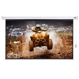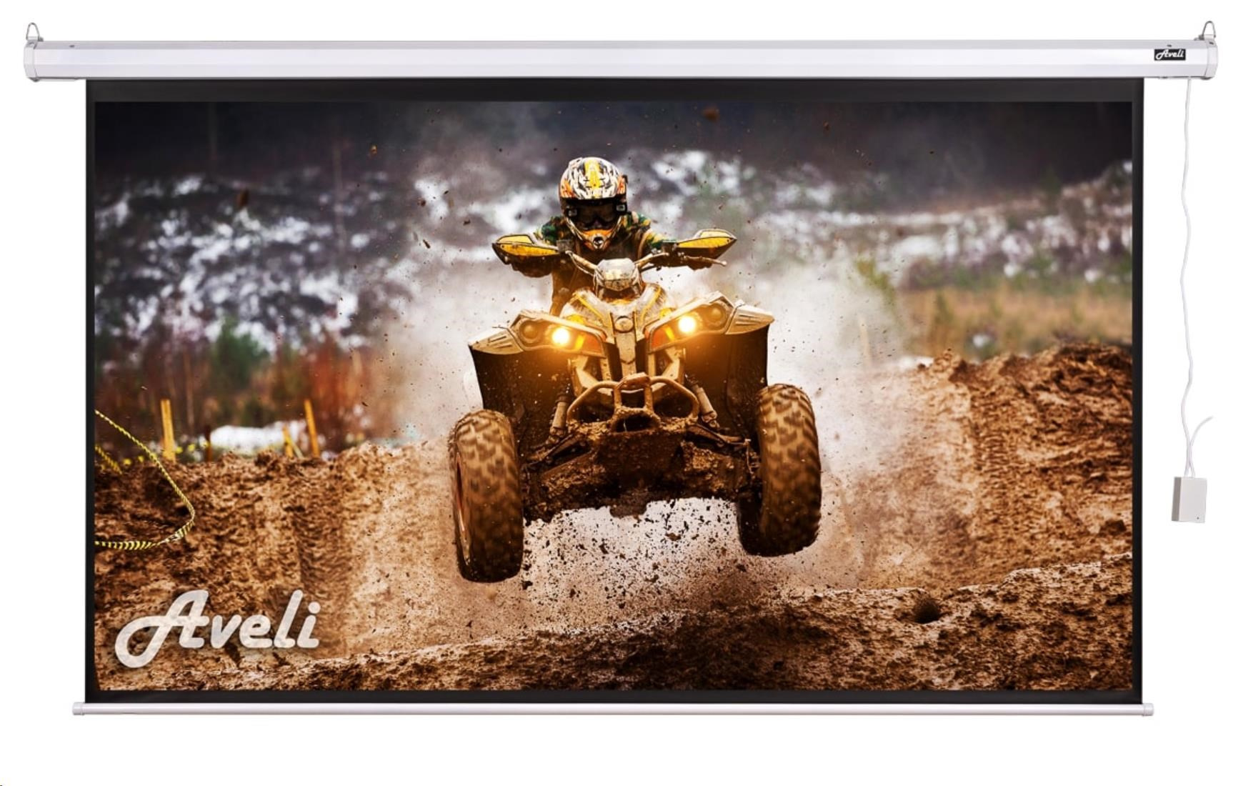 Projekčné plátno s roletou, rozmery 332 cm × 187 cm, uhlopriečka 150", pomer strán 16:9, matné biele plátno, čierne okraje, biele telo, na montáž na strop a na stenu, motor na navíjanie, s diaľkovým ovládaním