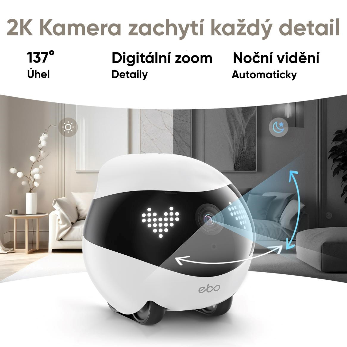 • Mobilný dohľad v reálnom čase – EBO Air 2 sa voľne pohybuje po dome na gumových pások a umožňuje sledovať dianie odkiaľkoľvek cez mobilnú aplikáciu. Robot dokáže zasielať notifikácie o zvláštnych udalostiach.