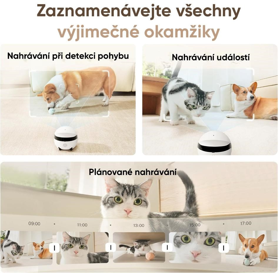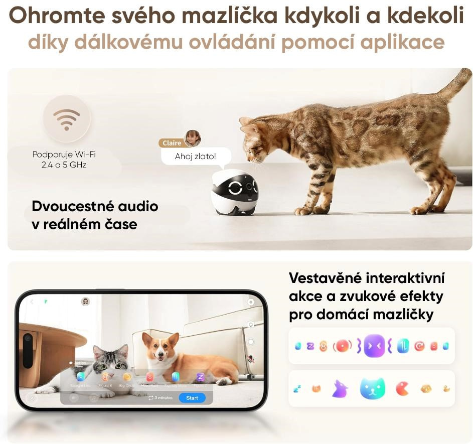 ROLA Mini nie je len kamera, ale interaktívny kamarát, ktorý pomáha zvieratám prekonať samotu a nudu, keď ste preč. Pohyb, zvuk i možnosť reagovať na váš hlas stimulujú prirodzenú zvedavosť a aktivitu zvieraťa. Robot dokáže miláčika baviť, upokojiť aj zaujať, čím prispieva k jeho duševnej pohode a lepšiemu správaniu počas vašej neprítomnosti.