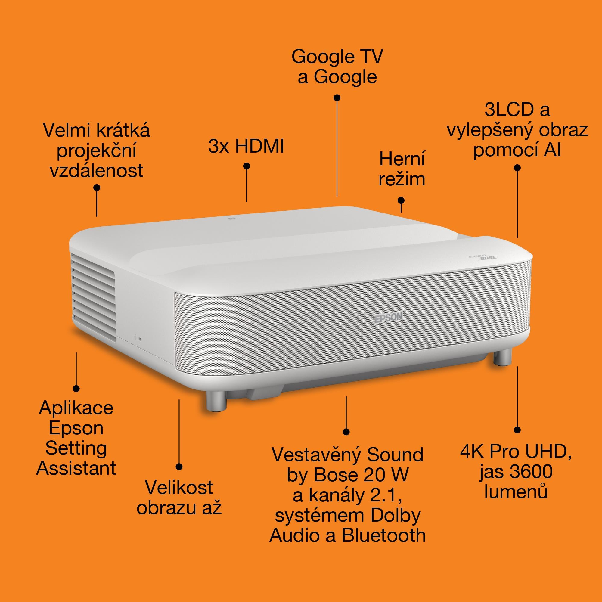 Použitie projektora: Domáce kino / hranie hier / streamovanie / televízie a set-top boxy; Typ projekcie: Ultra Short Throw (UST); Skutočné rozlíšenie projektora: 4K PRO-UHD (3840 × 2160); Projekčný pomer: 16:9; Projekčná vzdialenosť (min) (m): 0,3; Projekčná vzdialenosť (max) (m): 0,7; Uhlopriečka obrazu (max) ("): 120; Technológia: 3LCD (RGB so uzávierkou s kvapalnými kryštálmi C2 Fine); Zdroj svetla: Laser (životnosť až 20 000 h); Kontrast (hodnota : 1): 5 000 000; Jas (ANSI luse +) Dolby Audio + Bluetooth (20 W 2.1 kanálový systém);.prečítajte si viac