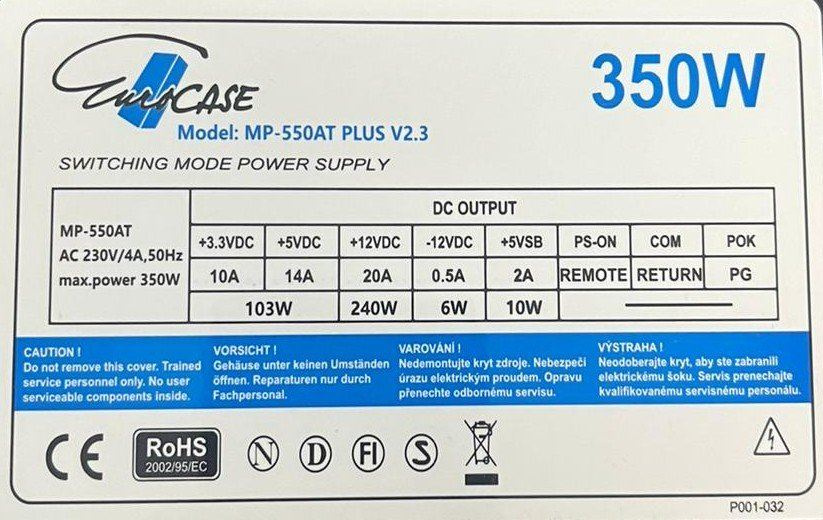 Napájací zdroj ATX značky Eurocase s výkonom 350W. Je osadený 120mm ventilátorom a pasívnym PFC (Power factor correction). Otáčky ventilátora sú riadené termoreguláciou. Zdroj spĺňa požiadavky na elektrickú bezpečnosť a elektromagnetickú kompatibilitu. Zdroj vyhovuje aj smernici 2005/32/EU = príkon v pohotovostnom režime.