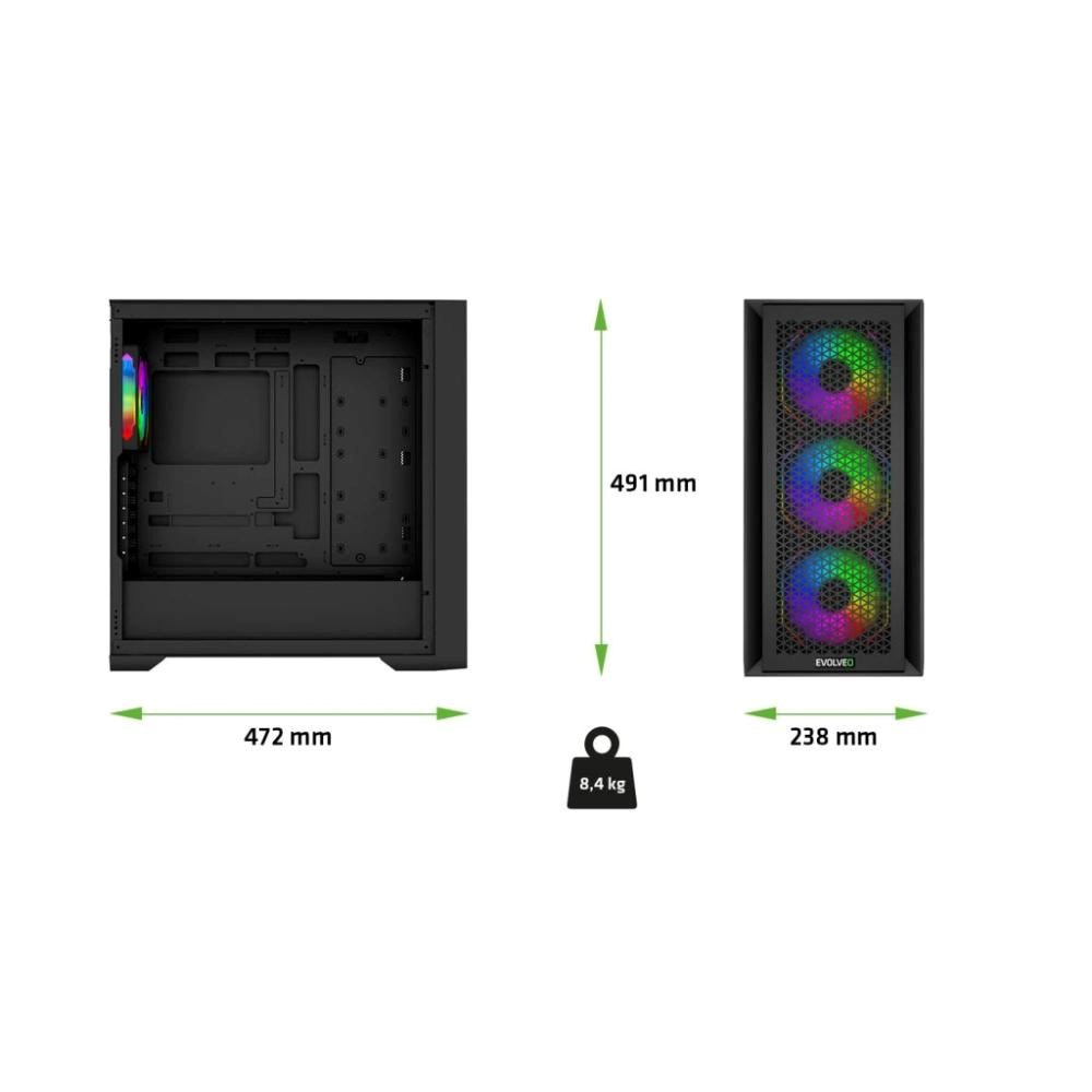 Co kdyby vaše počítačová skříň nebyla jen nudnou krabicí na hardware, ale opravdovým zlatým grálem vašeho herního koutku? Něčím, co ve vás při vstupu do místnosti vyvolá pocit hrdosti, jako když se díváte na nový vůz v garáži? EVOLVEO Rhino-BK-4 mění tento sen v realitu. Jde o velkorysou PC skříň typu Big Tower (rozměry 238 × 491 × 472 mm), která vašim herním ambicím poskytne nejen fyzický prostor, ale také vizuální styl a technickou vybavenost, kterou jako nároční hráči potřebujete. Skříň má robustní konstrukci s 0,7mm plechy a podporuje základní desky značek Intel i AMD celé řady formátů – ATX, eATX (Extended ATX), mATX (Micro ATX) i mITX (mini ITX). Jako ulitý jí padne napájecí zdroj klasického formátu ATX.