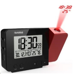 Digitálny budík s projekciou času a vnútornej teploty s LCD displejom, časom riadeným rádiovým signálom DCF-77 a meraním vnútornej teploty a relatívnej vlhkosti LCD displej o rozmere 63 x 42 mm s možnosťou stálého osvetlenia pri napájaní sieťovým adaptérom, alebo krátkodobým osvetlením na 8 s pri napájaní batériami 3 stupne jasu osvetlenia displeja, možnosť vypnutia osvetlenia displeja (pri napájaní sieťovým adaptérom) veľkosť číslic na displeji – čas 25 mm, dátum, skratka názvu dňa, vnútorná teplota a rel. vlhkosť 8,5 mm čas a dátum riadené signálom DCF-77 s možnosťou manuálneho nastavenia ikona príjmu signálu DCF-77 skratka názvu dňa 12-hodinový alebo 24-hodinový formát zobrazenia času možnosť nastavenia časového pásma od -12 do +12 hodín budík s 2 budícími časmi s funkciou opakovaného bdenia (Snooze) po 5 minútach budící signál - 10 sekúnd 1 pípnutie za sekundu, 10 sekúnd 2 pípnutia za sekundu, 10 sekúnd 4 pípnutia za sekundu a potom stály pípací zvuk projekcia času a vnútornej teploty s možnosťou otočenia obrazu o 180°, možnosť sklopenia tubusu projektora o 90° dopredu a dozadu farba projekcie červená stále projekcie pri napájaní sieťovým adaptérom s možnosťou vypnutia zobrazenie hodnôt vnútornej teploty a relatívnej vlhkosti zobrazenie teploty vo °C, alebo °F USB port na nabíjanie mobilných zariadení (len pri napájaní hlavnej jednotky sieťovým adaptérom), maximálny nabíjací prúd 1 000 mA napájanie sieťovým adaptérom, alebo batériami možnosť postavenia farba čierna Obsah balenia: 1 x digitálny budík GARNI 140 1 x sieťový adaptér český, slovenský, nemecký, anglický, taliansky, poľský a maďarský návod