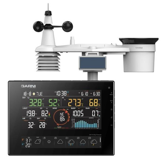 Integrované bezdrôtové čidlo 7-v-1 GARNI 1NG meria vonkajšiu teplotu a relatívnu vlhkosť, rýchlosť a smer vetra, dažďové zrážky, UV index a slnečné žiarenie, a dáta sú odosielané do hlavnej jednotky až do vzdialenosti 150 m (v otvorenom priestore). Napájanie zabezpečuje vstavaný kapacitor, ktorý je nabíjaný pomocou vstavaného solárneho panelu. Batéria slúži ako záložný zdroj. Čidlá sú úplne smontované a kalibrované, aby bola inštalácia čo najjednoduchšia. Hlavná jednotka je vybavená ľahko čitateľným displejom VA s ultračiernym pozadím a automatickou reguláciou jasu, ktorý okrem dát zo všetkých pripojených čidiel (napr. čidla na meranie teploty a relatívnej vlhkosti, bazénové čidlo, čidlo vlhkosti a teploty pôdy, čidlo detekcie búrok, čidlo kvality ovzdušia) zobrazuje predpoveď počasia, barometrický tlak, indikátory počasia spolu s pokročilými funkciami a informáciami, ako je výstražný alarm pre vysoké/nízke namerané hodnoty a stratu spojenia s čidlami prostredníctvom notifikácií v mobilnej aplikácii, a iné. Vysokorýchlostný procesor hlavnej jednotky analyzuje namerané hodnoty meteorologických veličín, vstavaná pamäť uchováva maximálne / minimálne namerané hodnoty za daný deň alebo od začiatku merania, a automaticky nastavuje čas a dátum z internetu. Jednoduché ovládanie, ľahká údržba, možnosť kalibrácie, zobrazenie času východu a západu Slnka a Mesiaca, zobrazenie fázy Mesiaca, automatická regulácia jasu displeja, množstvo meraných veličín a dlhodobá predpoveď robí z nej výnimočnú profesionálnu meteorologickú stanicu pre váš domov.