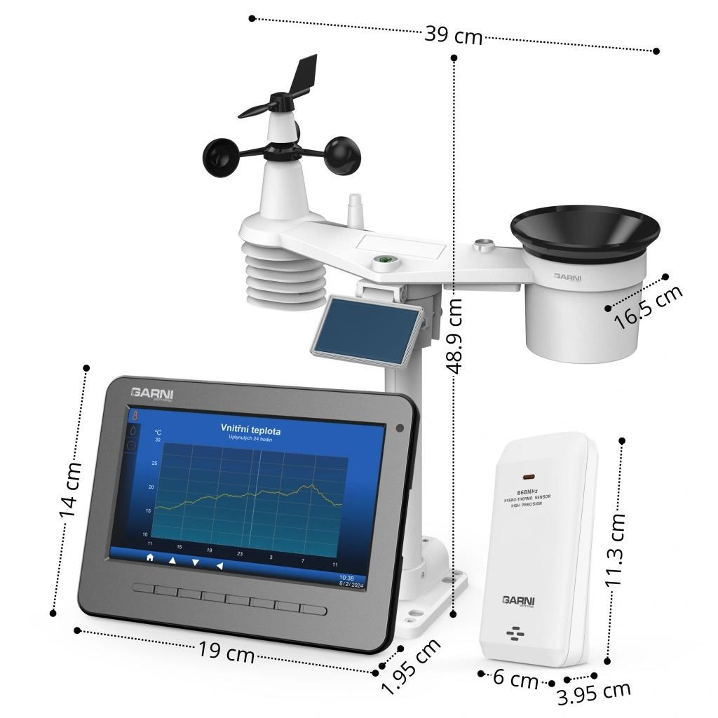 Poloprofesionálna Wi-Fi meteorologická stanica model GARNI 3015 Arcus s integrovaným bezdrôtovým snímačom 7-v-1 so solárnym panelom a vstavaným kondenzátorom a prídavným bezdrôtovým snímačom GARNI 055H, ktorá je vybavená mnohými funkciami zhromažďuje presné a podrobné údaje o počasí. Integrovaný bezdrôtový snímač pracuje na frekvencii 868 MHz a meria teplotu a relatívnu vlhkosť, rýchlosť a smer vetra, zrážky, barometrický tlak, UV index a intenzitu slnečného žiarenia. Výrobok využíva vysoko presné švajčiarske senzory SENSIRION a umožňuje kalibráciu niektorých meteorologických veličín.